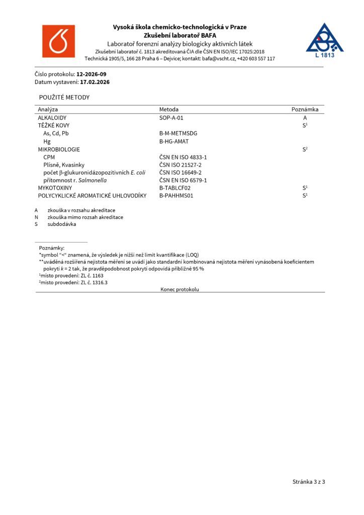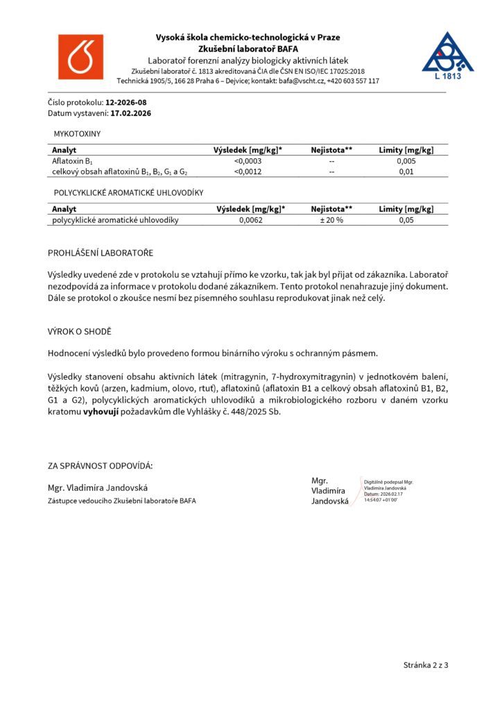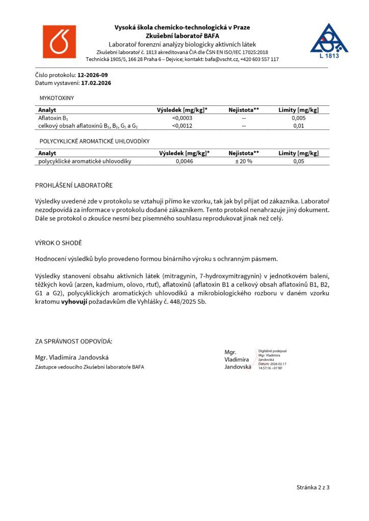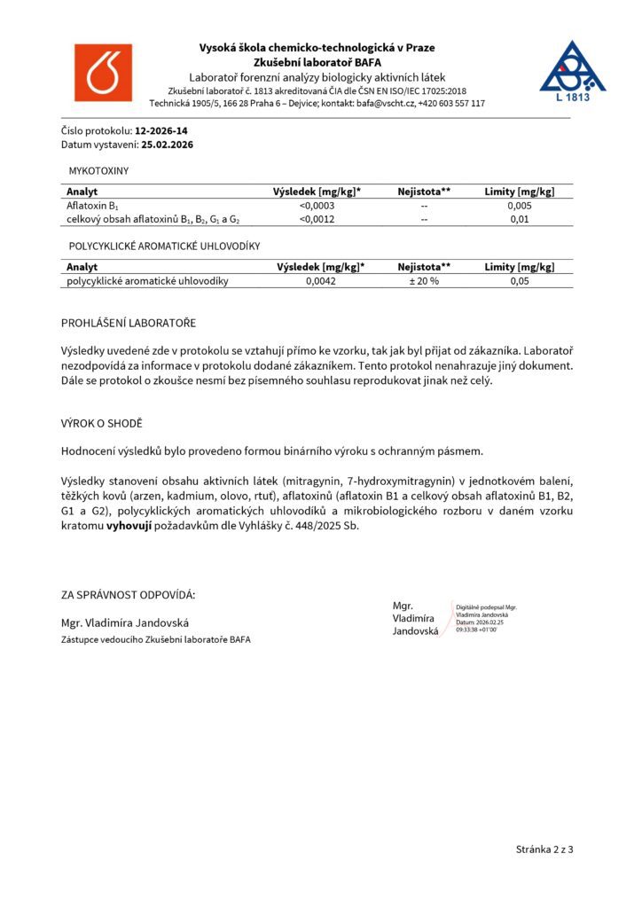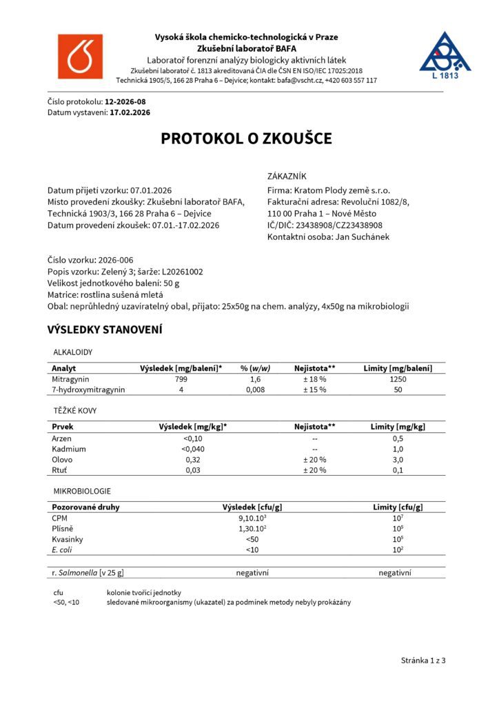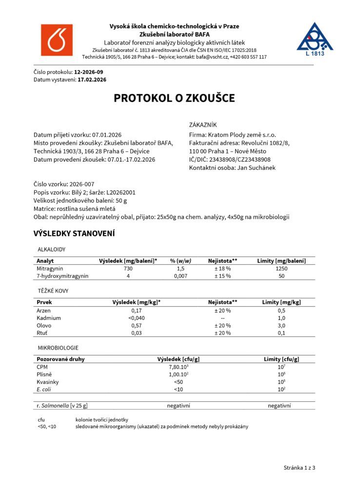 DomůLaboratorní testy – KRATOM (PML)Laboratorní testy - KRATOMZelený kratom - číslo šarže L20261002 Bílý kratom - číslo šarže L20262001 Červený kratom - číslo šarže L20265001